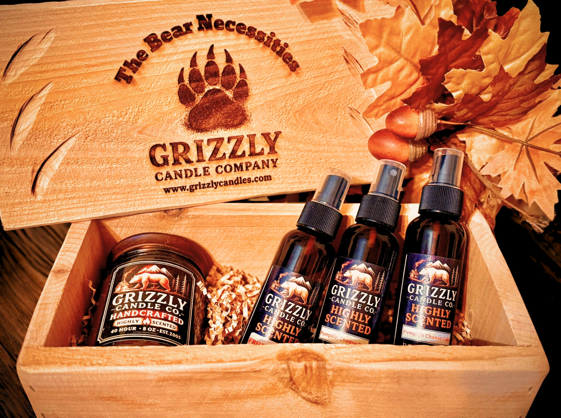 Bring warmth and freshness into any space with our Grizzly Candle Co. Handcrafted Gift Box. This deluxe set includes one 8 oz hand-poured candle and three 4 oz room sprays, all customizable with your choice of our 16 signature fragrances.
